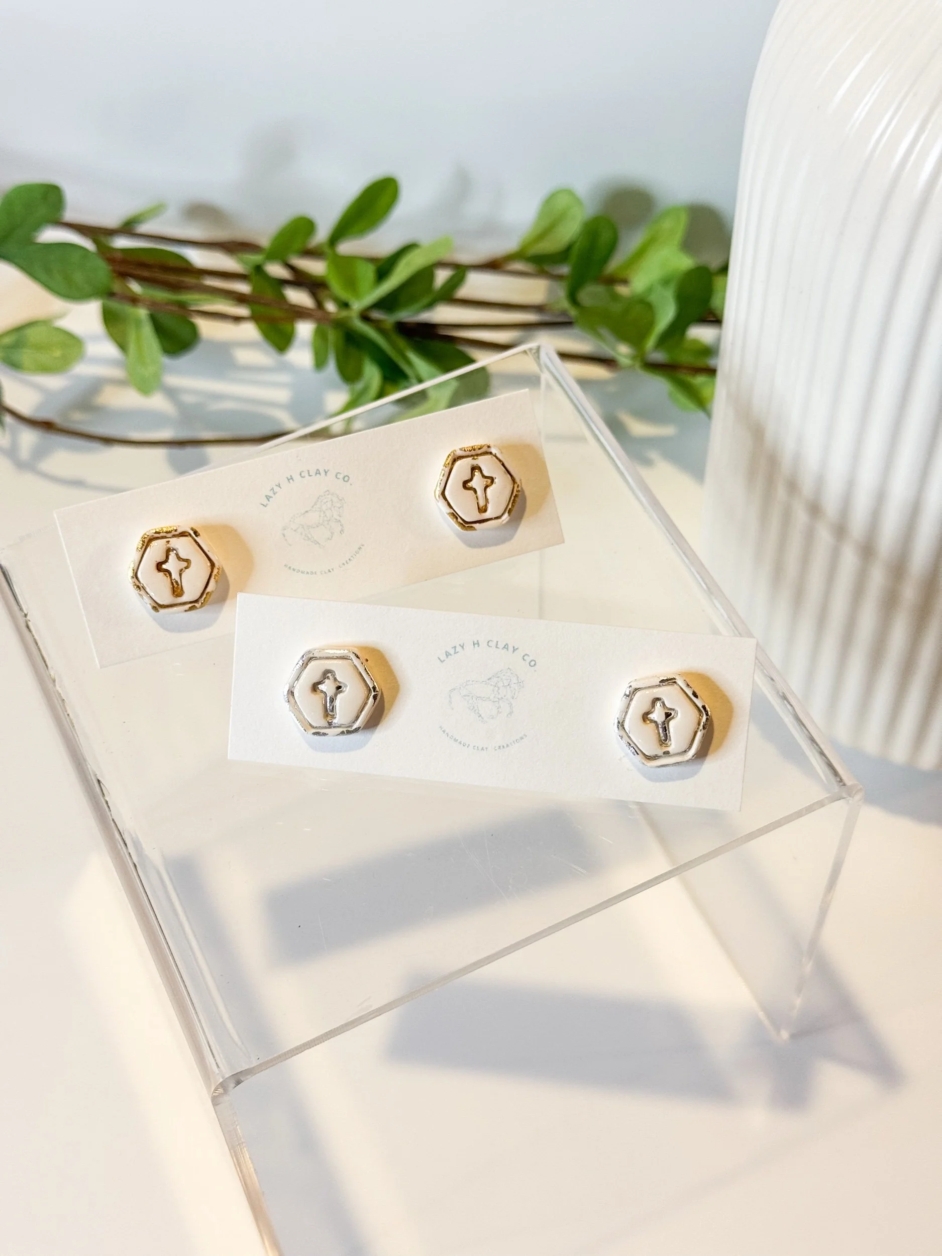 Simple Gospel Studs are my free gift with purchase for this launch. Each pair is handmade and lightweight, featuring a clean little cross detail with a distressed foil finish. Choose your finish at checkout: gold or silver.